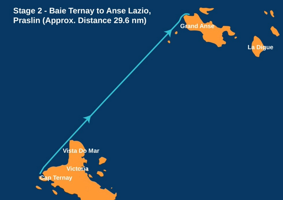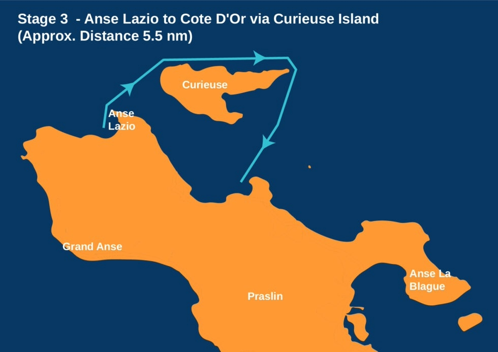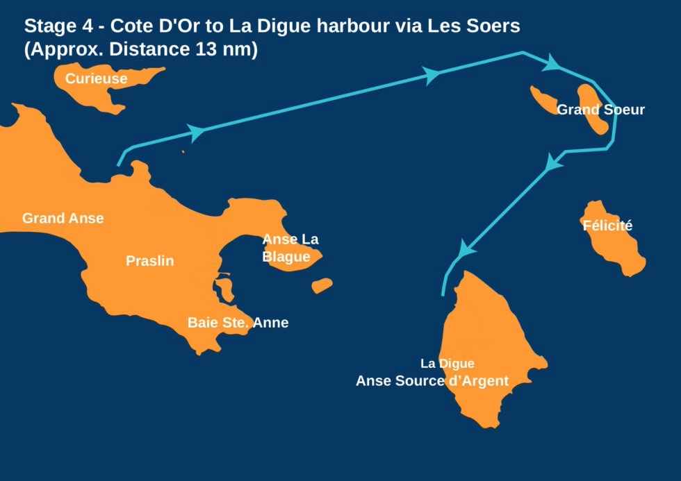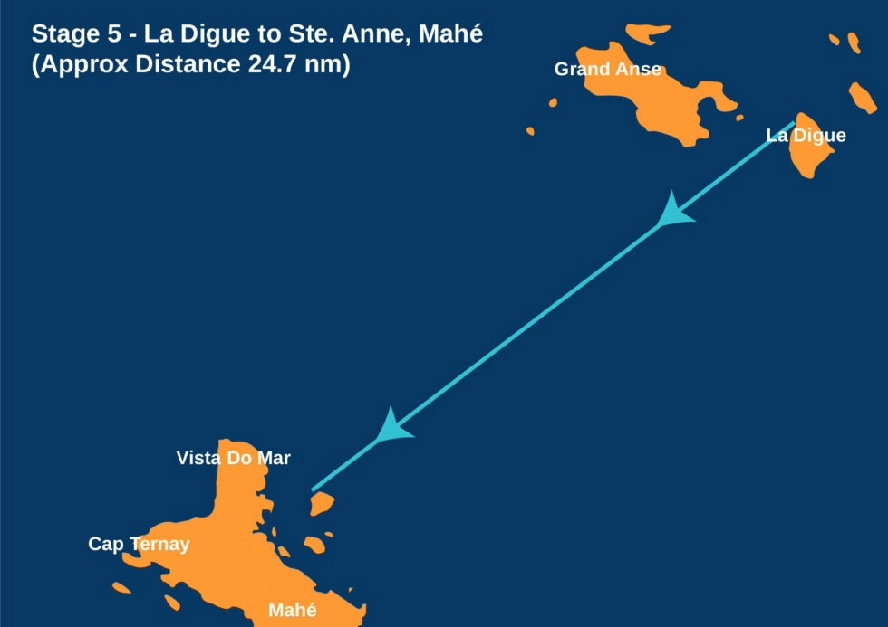 - 11:00 – Erstes Warnsignal, Nähe Cote D'Or, Les Soers (S), Ziel vor der Hafeneinfahrt der Insel La Digue.