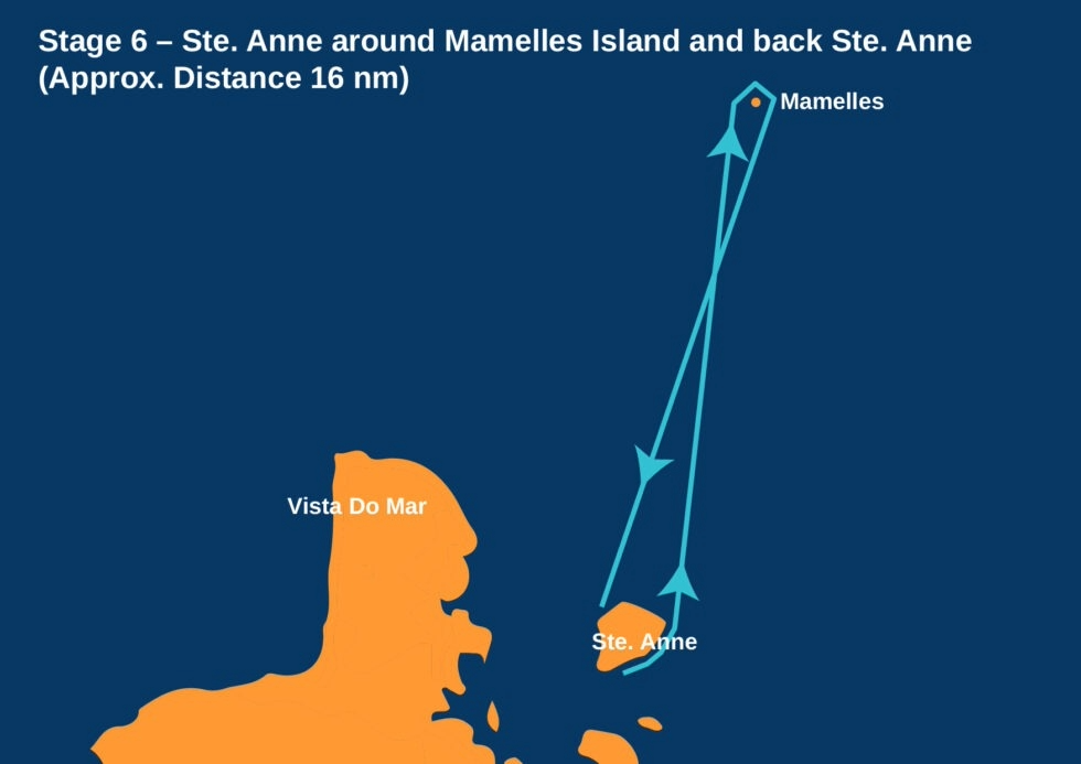 - 11:00 – Erstes Warnsignal, Nähe Saint Anne Ostseite, Mamelles Felsen (S), Ziel Ste. Anne Westseite.