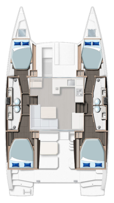 Die Katamarane sind stilvoll und luxuriös ausgestattet. Der großzügige Innenraum verfügt über ein Dachfenster, eine U-förmige, nach vorne gerichtete Pantry sowie Deckstüren zum Vorderdeck und Achtern. Die vier Kabinen haben Doppelbetten mit Zugang von beiden Seiten und eigene Nasszellen.
