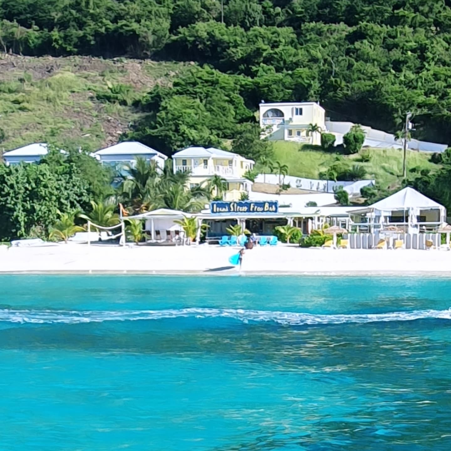 6) Jost van Dyke mit der berühmten Soggy Dollar Bar, wo man den legendären Painkiller am liebsten in nasser Badeshorts oder direkt im türkis-farbenen Wasser der White Bay mit Blick auf die Yachten schlürft.