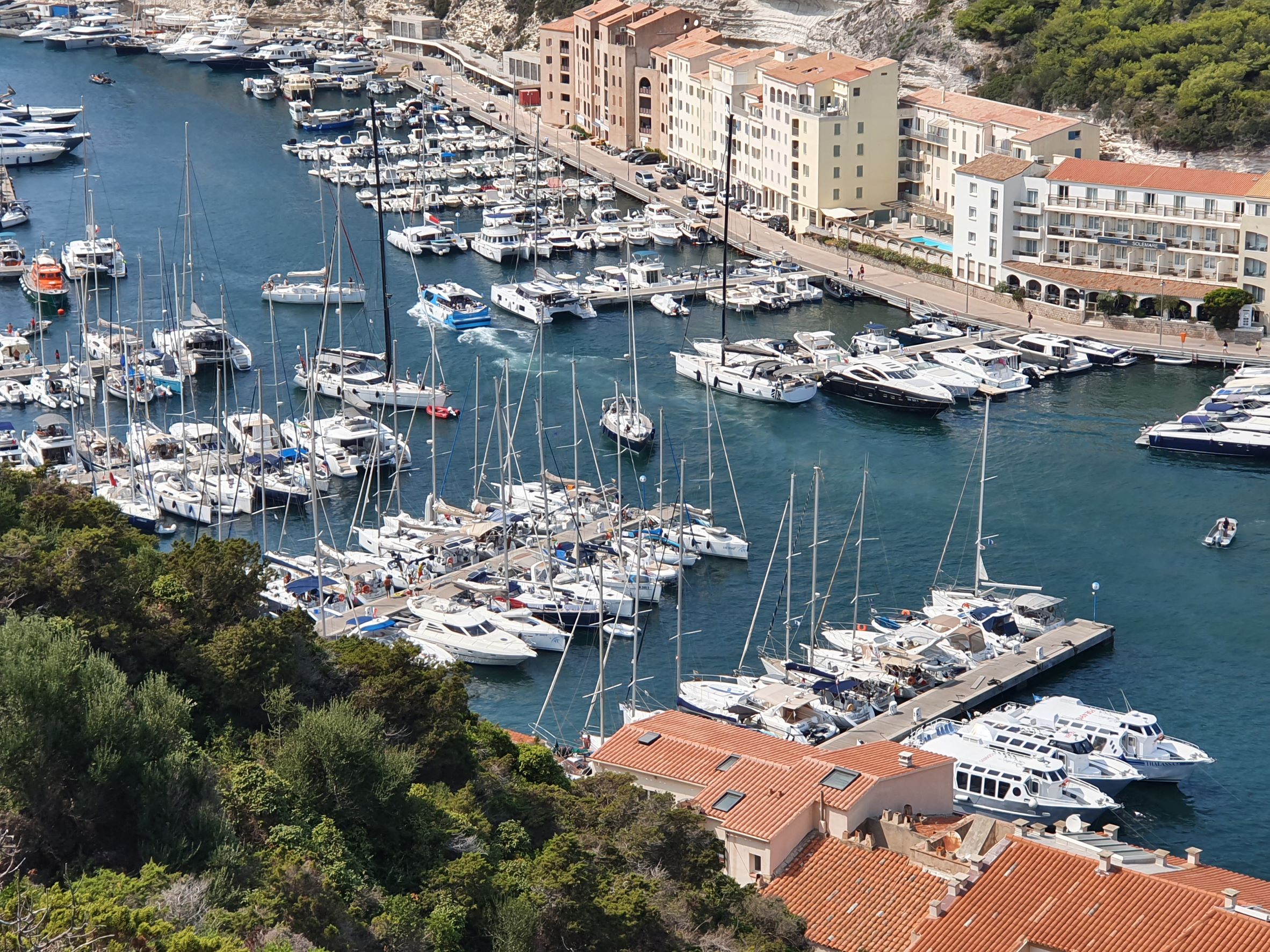 Wir haben es glücklicherweise nicht mehr weit, nehmen Kurs auf Bonifacio und laufen Wind und Welle einfach ab. Es weht schon deutlich stärker als angesagt. Eigentlich soll es ab 14h soll es richtig losgehen, aber jetzt ist es bereits äußerst ungemütlich. Wir wollen schnellstmöglich ankommen und uns verräumen. Mit der Idee sind wir nicht allein. Die ohnehin enge, uneinsichtige und unangenehme Einfahrt ist bei dem Wind und den Wellen abenteuerlich. Einmal drin, wird wenigstens das Wasser sehr viel ruhiger und wir bestaunen den engen Fjord. Es ist wunderschön, hier entlang zu fahren.