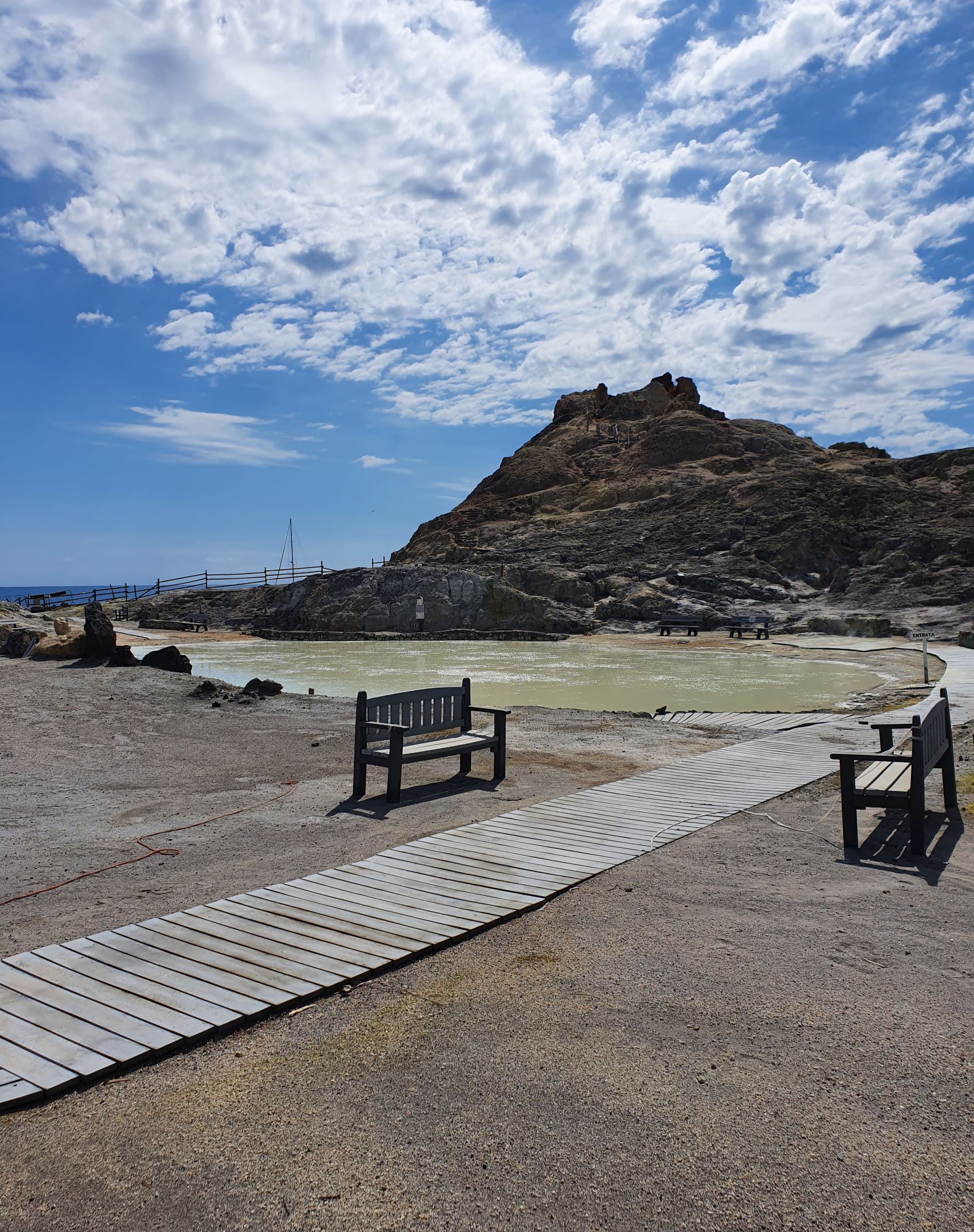 Das Vulkanschlammbad ist zwar nicht zugängig, aber die die heißen Quellen in der Bucht vor den Thermen sind frei. Auf dem Rückweg vom Schwimmevent gehen wir vom Strand direkt ins Wasser und waten vorsichtig über glitschige Steine in die stinkende, blubbernde, warme Brühe. Wir sind bei weitem nicht die einzigen. Etliche Badegäste sammeln sich in Grüppchen vorwiegend an den Stellen, an denen die heißen Gase blubbernd an die Oberfläche steigen.