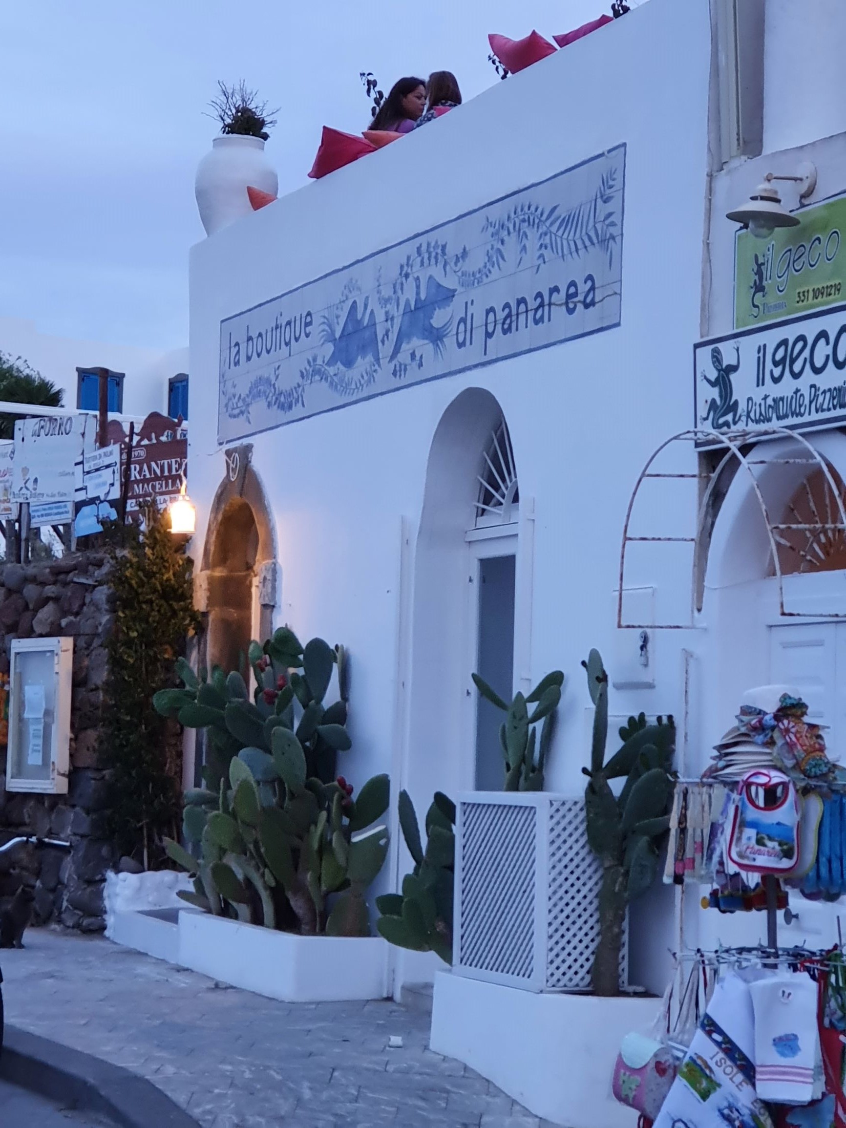 Wer kein Freund von Landgängen ist, sollte auf Panarea unbedingt eine Ausnahme machen. Der Ort ist ganz bezaubernd. Alles sehr schick, sehr aufgeräumt, und zugleich liebevoll verspielt - es herrscht eine herzliche Atmosphäre. Was ebenfalls zum Charme der Insel beträgt ist, dass viele nur mit Elektrofahrzeugen - vorzugsweise Golfcarts - unterwegs sind. Die Carabinieri eingeschlossen. Tatsächlich ist Panarea die Insel der Wohlhabenden, die auch hier ihre Häuser haben. Der Wohlstand ist überall zu spüren ohne überzogen mondän zu sein. Es gibt sehr süße Geschäfte, in denen geschmackvolle Souvenirs, Mode und Einrichtungsgegenstände angeboten werden. Wieder begegnen uns die Teste di Moro. Und zum ersten Mal das Motto, das schlussendlich auch das unseres Urlaubs werden soll: Mollo tutto.