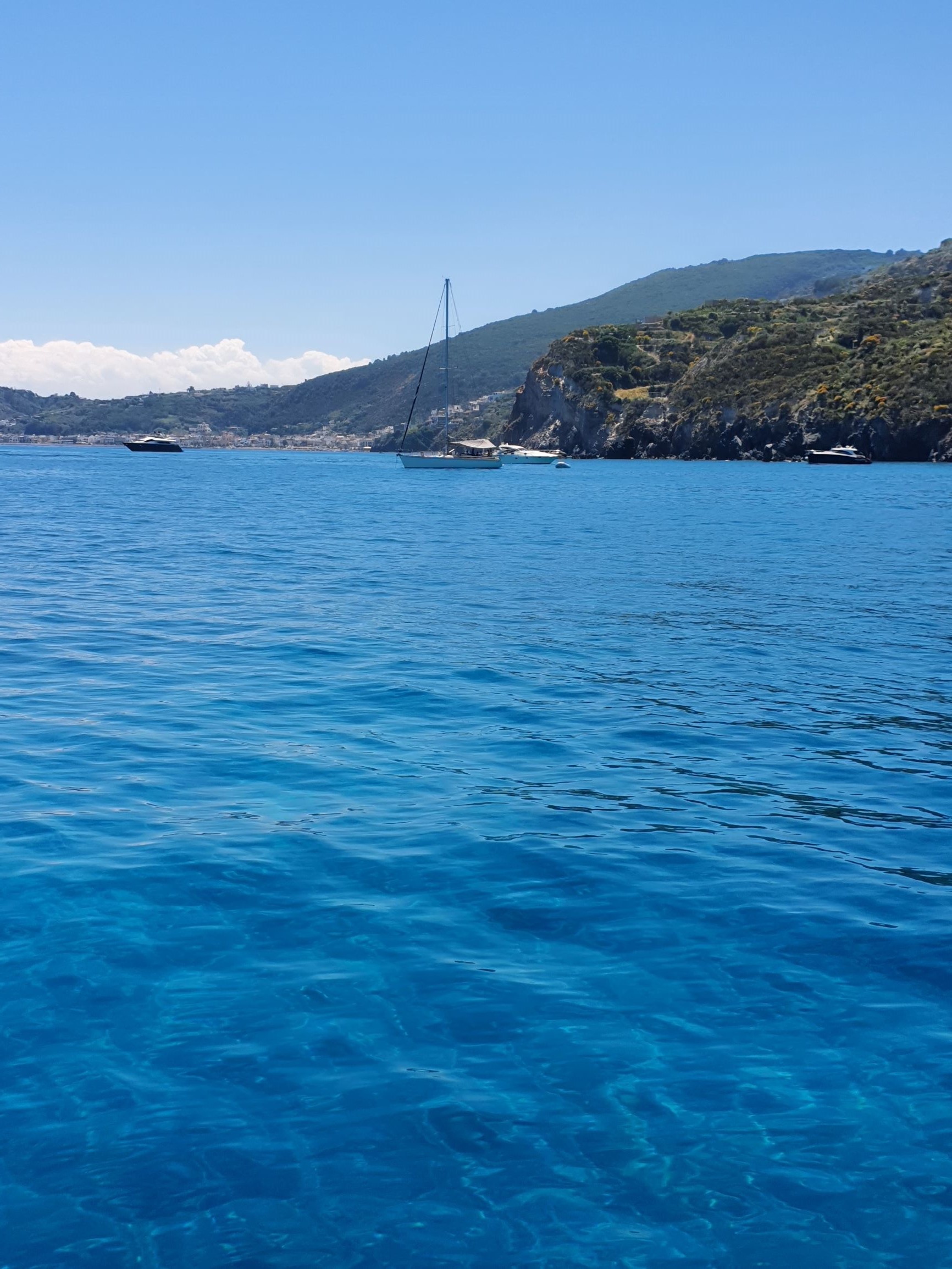 Da Äolus wohl mal wieder anderswo zu tun hat, verbringen wir einen ausgedehnten Badenachmittag in der nördlichen Bucht von Pignataro, zwischen Canneto und Porticello. Das Wasser ist karibisch türkis. Fehlen eigentlich nur noch die steel-drums. Die Ruine an Land bildet einen skurrilen Kontrast zu der ursprünglichen Natur rundherum. Es liegen noch ein paar Yachten vor Anker. Auch wenn der erlaubte Ankerbereich eingeschränkt ist, ist hier immer noch reichlich Platz.