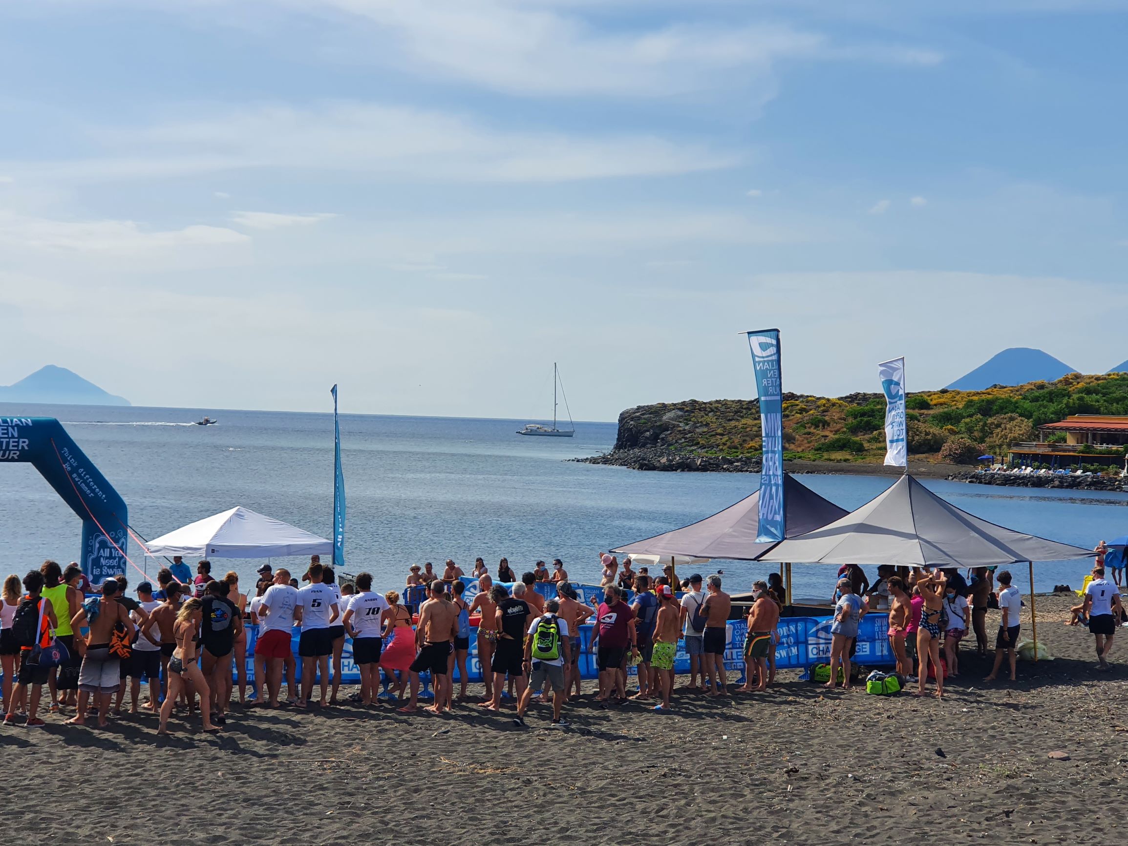 Über den schmalen Streifen gehen wir zu Fuß über den heißen schwarzen Vulkansand rüber zum Strand von Porto di Ponente, schauen uns die Schwimmwettkämpfe und die Siegerehrung an. Wir verstehen zwar kaum ein Wort, aber die gute Laune ist multilingual ansteckend. Es herrscht buntes Treiben, Ausgelassenheit, Heiterkeit. Es ist deutlich zu spüren, wir froh alle sind, dass das Event, auf das die Athleten lange hintrainieren, stattfinden kann.